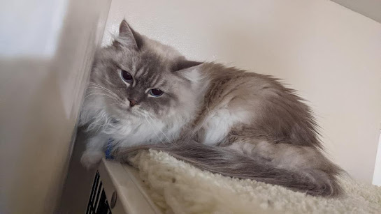 Angus likes to relax in his condo and he loves chin scratches!
